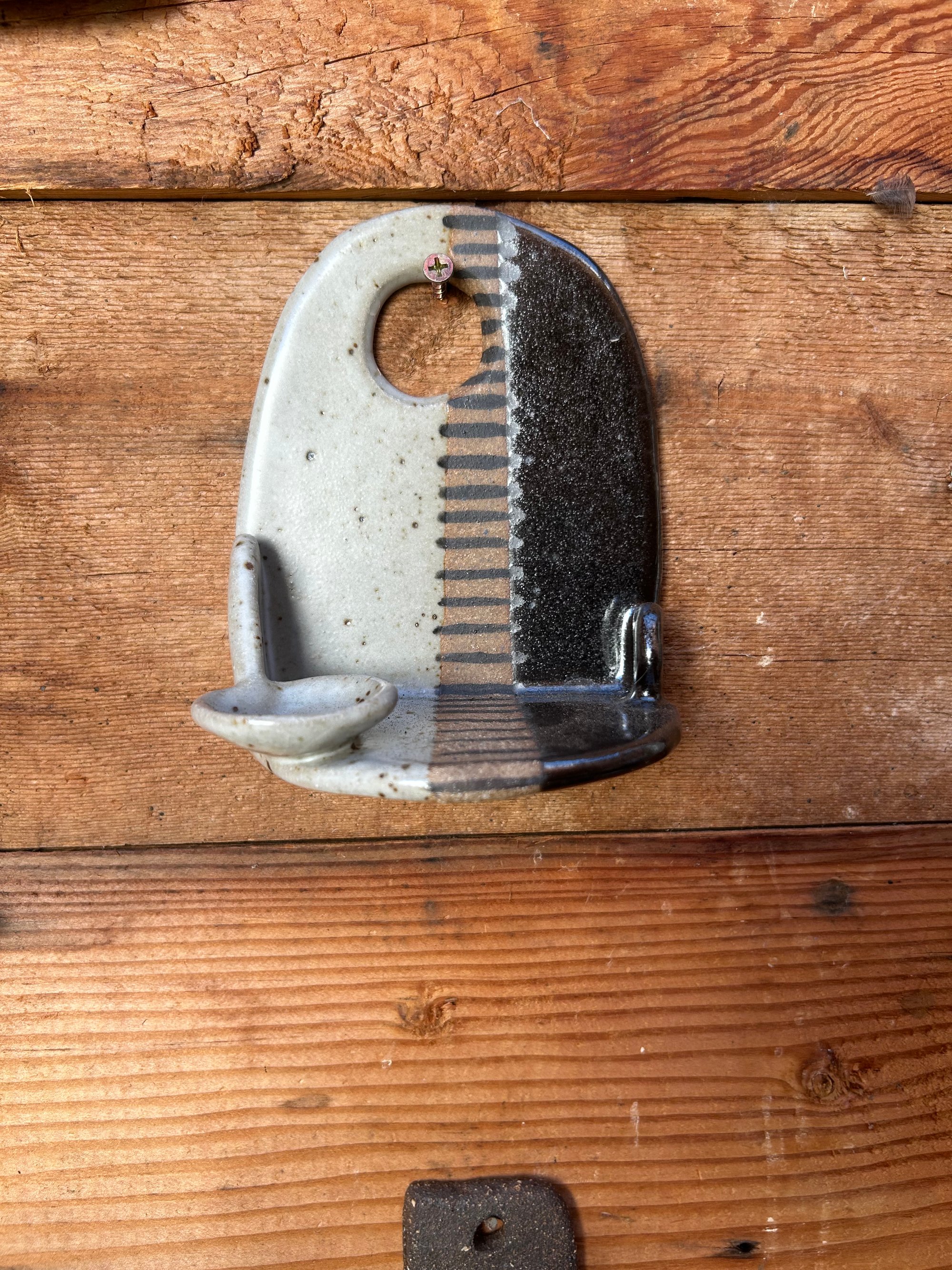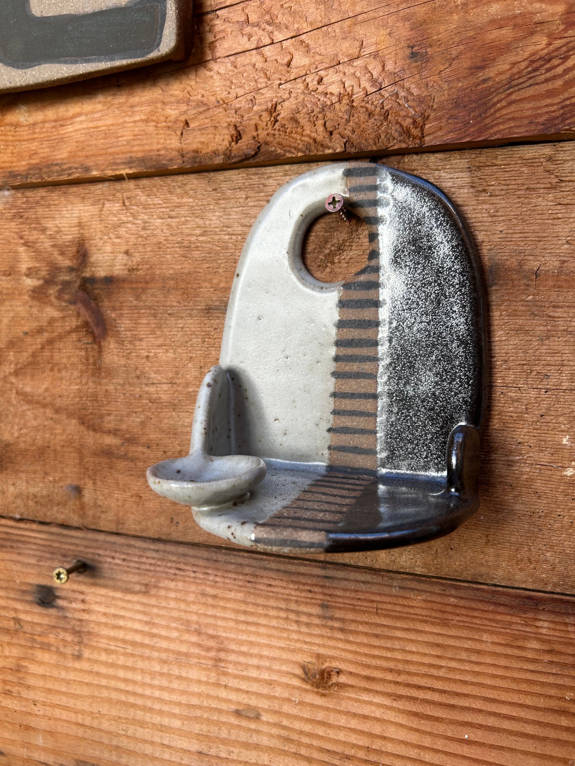 Dipped white and black with my hand painted lines to connect the two sides. A tiny dish towards the front for your precious tiny things. The ends are capped with uprights to contain your chosen items upon this shelf -- black side has a hole on top for incense or your favorite tiny stemmed something...