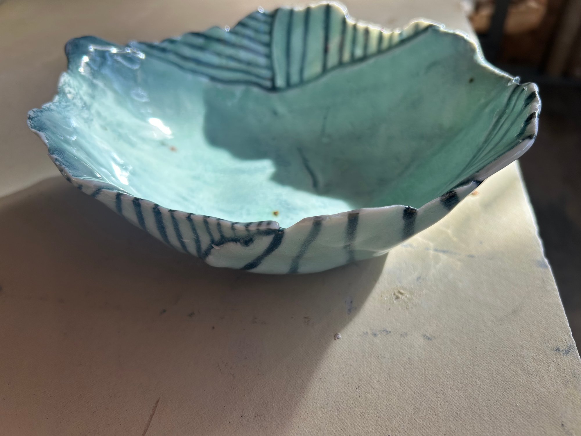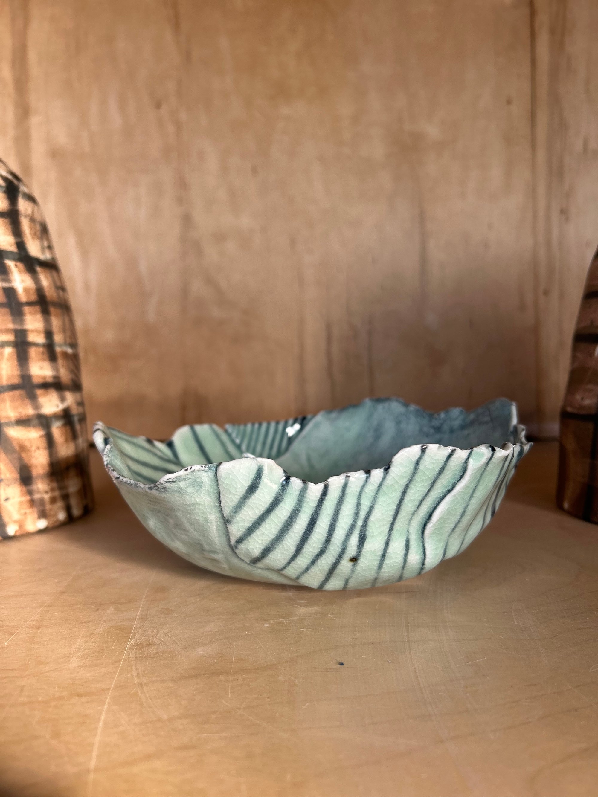 The glaze makes for a food safe lux celadon glow. Fired to cone 10 in a gas reduction kiln.